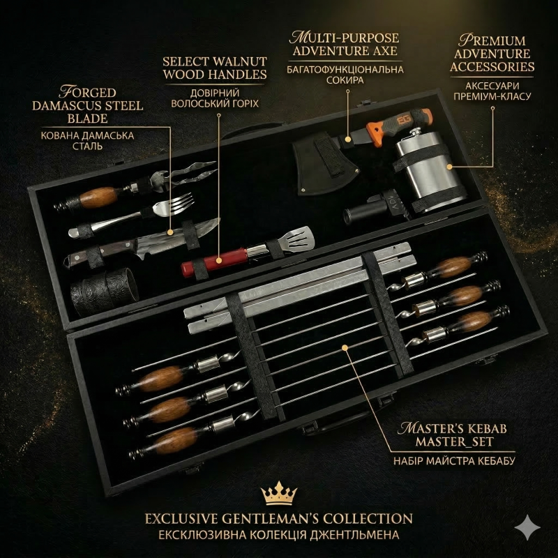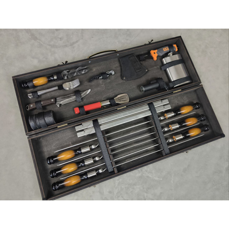 Цей набір стане чудовим подарунком для чоловіка, який любить готувати шашлики та цінує якісні аксесуари. Усі елементи компактно розміщені в міцній дерев’яній коробці з ручкою, що додає презентабельності та зручності у транспортуванні.