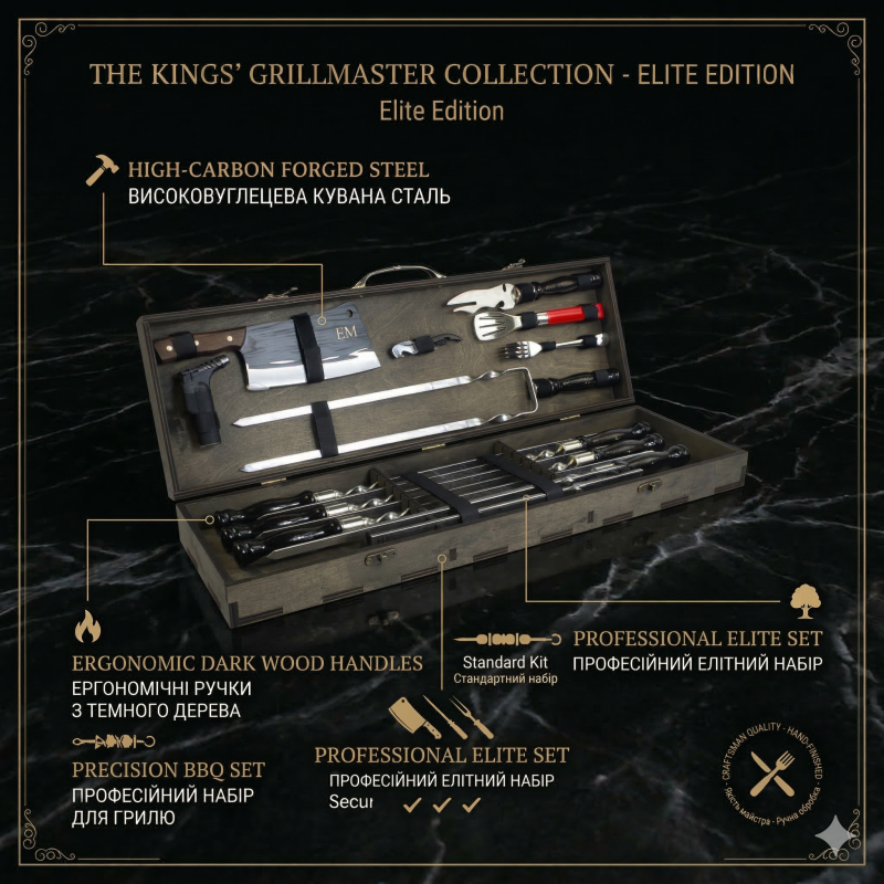 • Подарунковий шашличний набір **Moltis MT-10538 Темний** – це чудовий вибір для чоловіка, який цінує якість і комфорт під час відпочинку на природі. Набір упакований у міцну дерев'яну коробку, що додає йому солідності та робить його ідеальним подарунком.