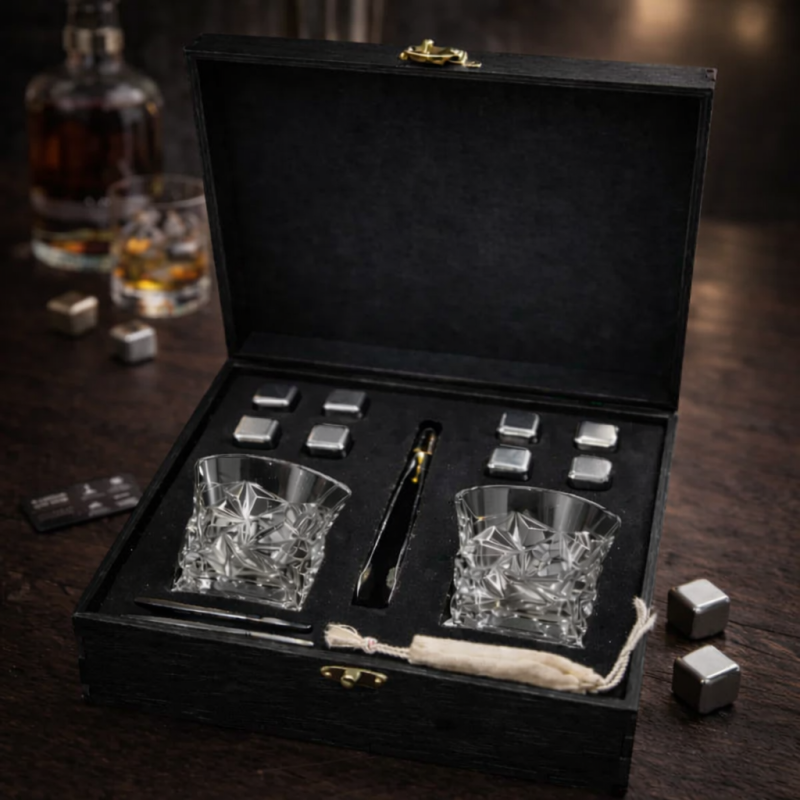 Головна перевага набору — срібні металеві охолоджувальні кубики, які дозволяють охолодити віскі без розведення водою. На відміну від льоду, вони не тануть, не змінюють структуру напою та зберігають його натуральний смак і аромат.