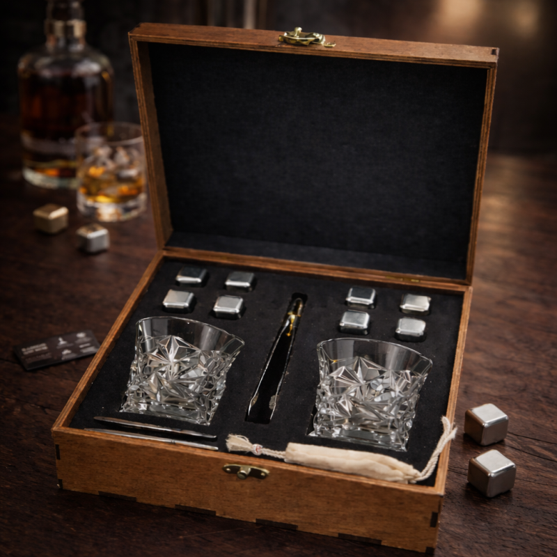 Головна перевага набору — срібні металеві охолоджувальні кубики, які дозволяють охолодити віскі без розведення водою. На відміну від льоду, вони не тануть, не змінюють структуру напою та зберігають його натуральний смак і аромат.