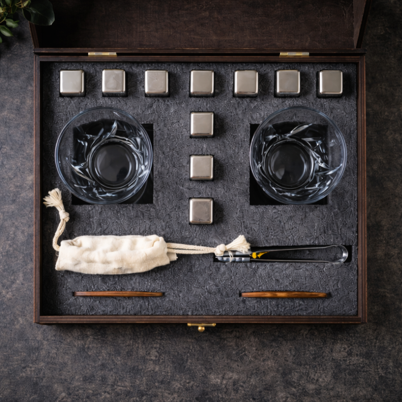 До набору входять 2 склянки для віскі, 9 металевих охолоджувальних кубиків, дерев’яні підстаканники, щипці та мішечок для зберігання. Металеві кубики швидко охолоджують напій, не розбавляючи його водою, завдяки чому повністю зберігається насичений смак і аромат віскі.