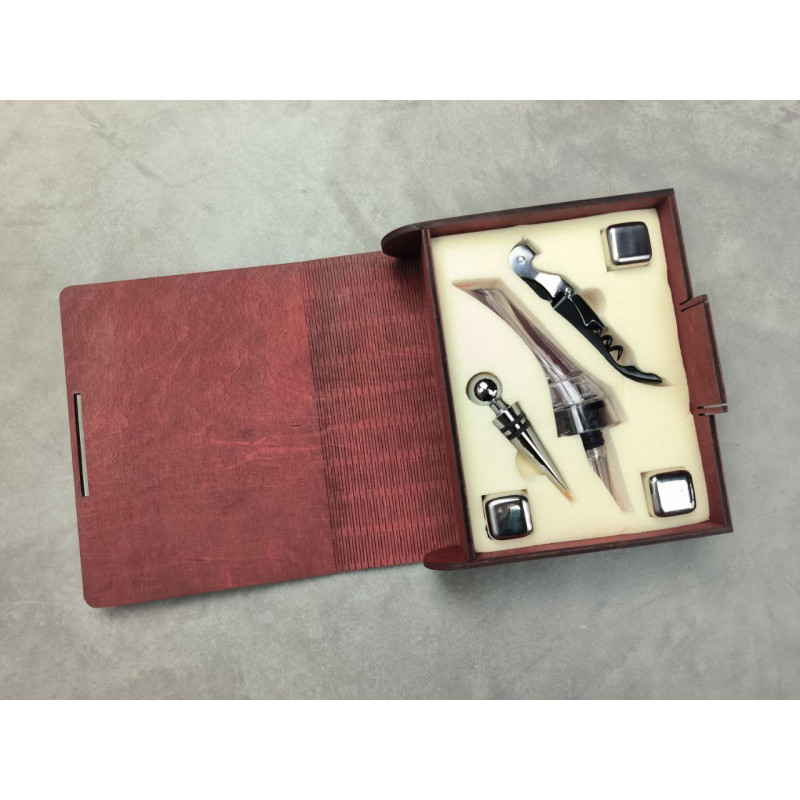 Изысканный винный набор в стильной деревянной коробке в форме книги – отличный подарок для ценителей вина. Его продуманная комплектация позволяет наслаждаться любимым напитком с максимальным комфортом.