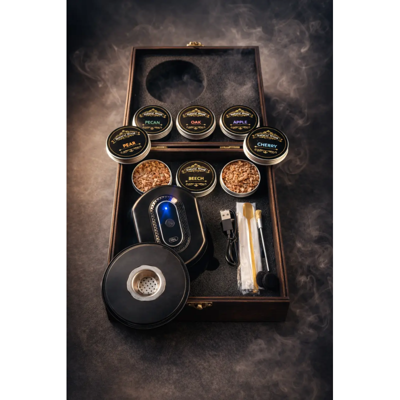 Смокер для віскі Moltis — це сучасний електричний набір для ароматного копчення віскі, бурбону, рому та коктейлів у домашніх умовах. Завдяки вбудованому електричному нагрівальному елементу пристрій самостійно підпалює деревну тріску, без використання газу чи відкритого полум’я.