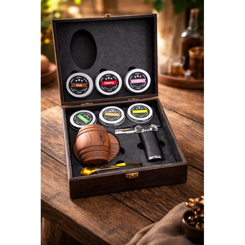 Смокер для віскі Moltis — це преміальний набір для ароматного копчення напоїв, створений для поціновувачів віскі, бурбону, рому та коктейлів. За допомогою цього набору ви легко додасте напоям глибокий аромат диму та нові смакові нотки прямо у себе вдома, як у професійному барі.